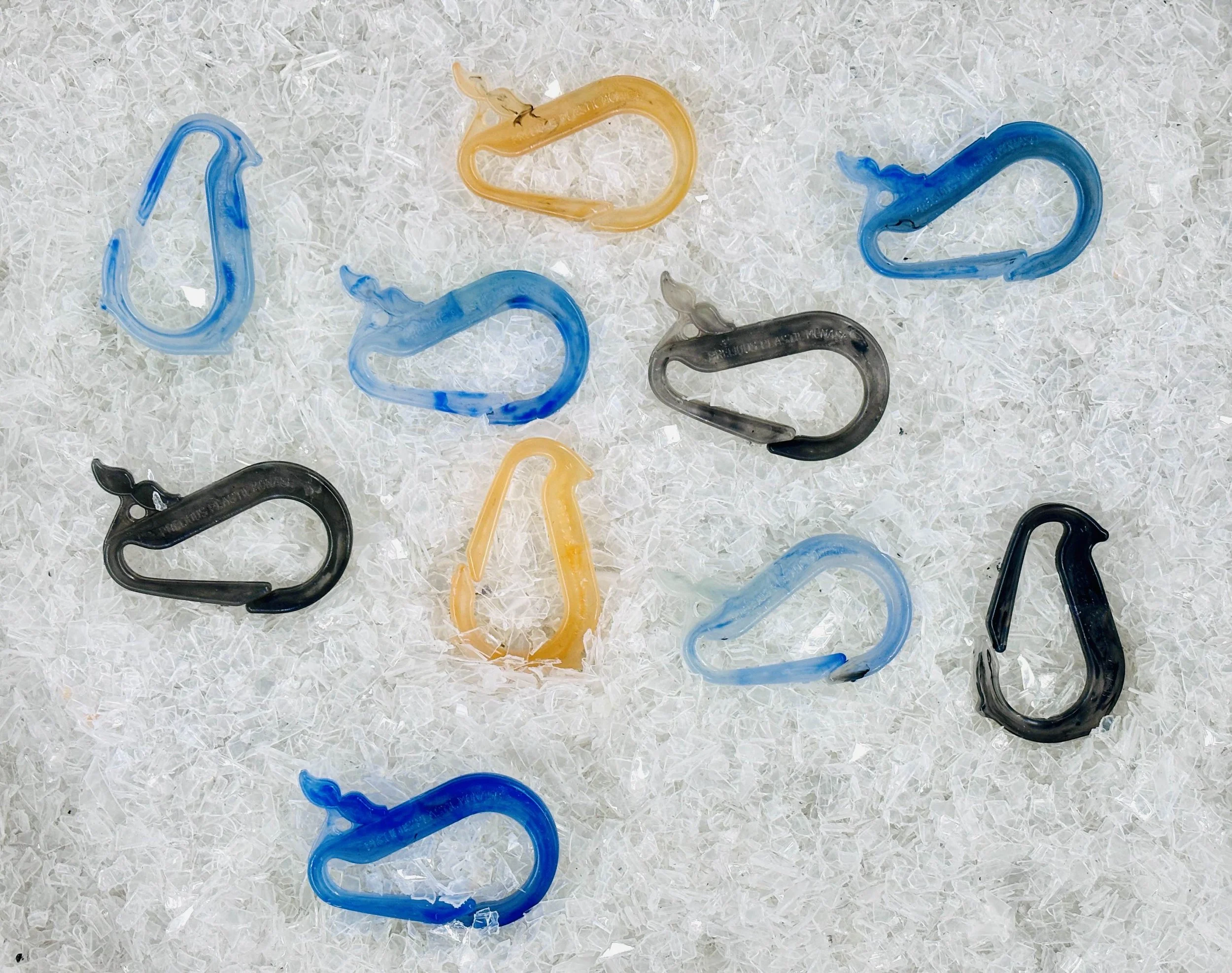 Made out of 100% recycled PP: carabiners that come in the shape of a penguin or a whale.